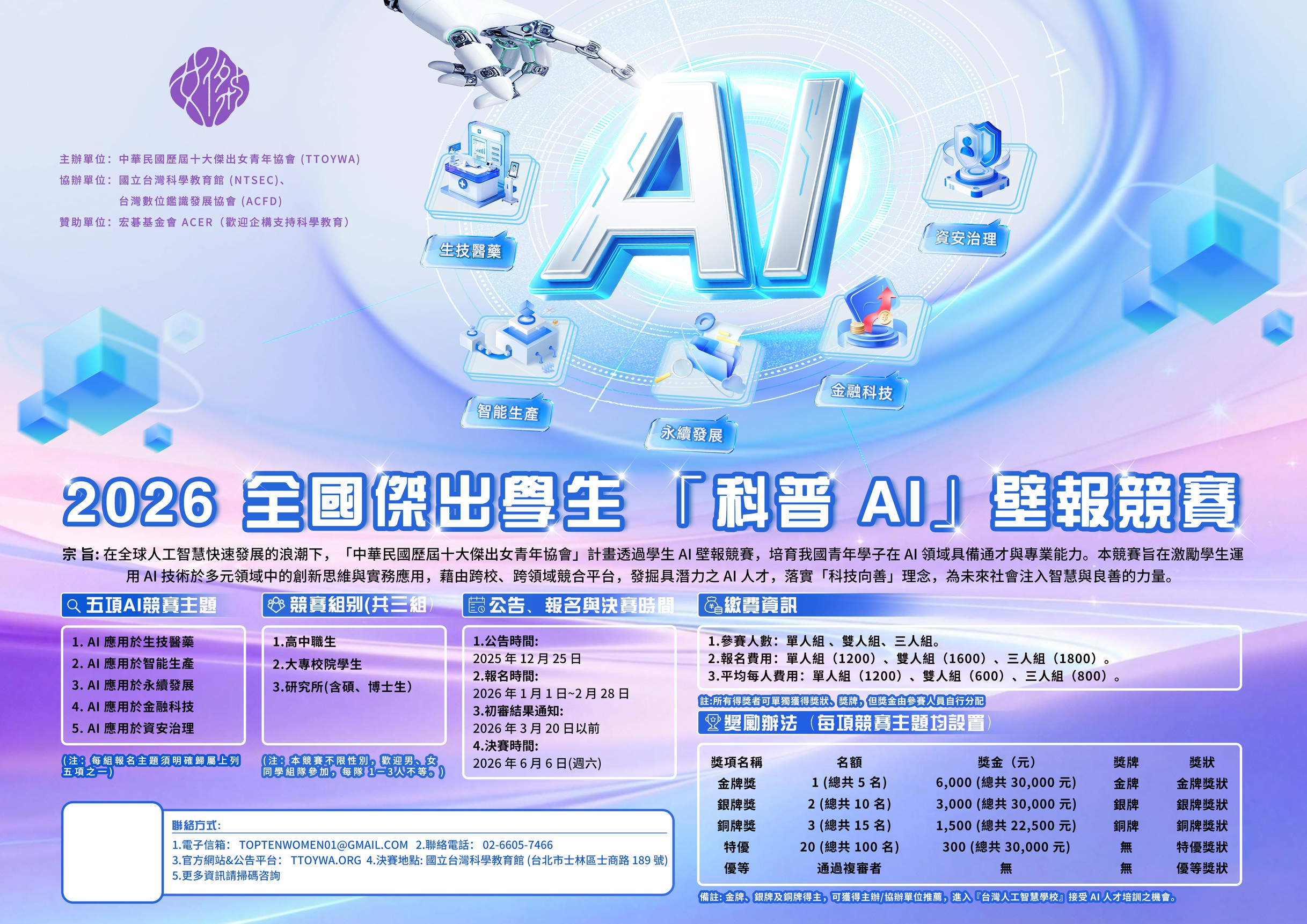 2026全國傑出學生「科普AI」壁報競賽開始報名!即日起受理投件,歡迎推薦學生報名參與2026.1.28/在: 活動快訊 報名連結: 2026 全國傑出學生「科普 AI」 壁報競賽辦法 https://ttoywa.org/wp-content/uploads/2026/01/2026-全國學生科普-AI壁報競賽-A3橫式海報-1215-2.jpg 1722 2435 ttoywaustory /wp-content/uploads/2025/04/女傑LOGO-中英heading-2.jpg ttoywaustory2026-01-28 13:46:122026-01-28 13:47:242026全國傑出學生「科普AI」壁報競賽開始報名!即日起受理投件,歡迎推薦學生報名參與